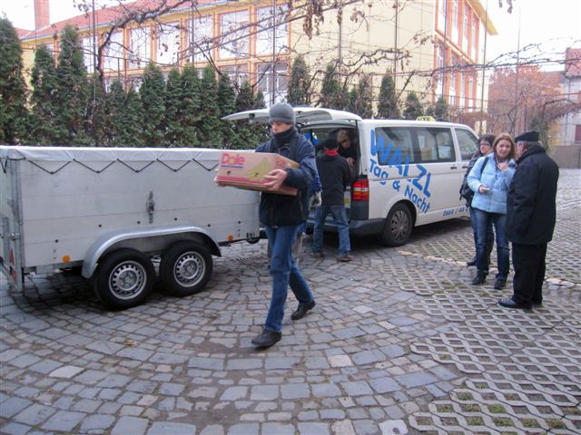 Unsere nächste Lieferung geht an die Kindertagesstätte, dort bekommen die Kinder eine warme Mahlzeit und Unterstützung beim lernen. Auf dem Gelände des ehemaligen Pfarrhofes hat die Caritas noch viel Arbeit vor sich, es wird in einem Nebengebäude gerade eine Pflegestation mit Krankenbetten (alle Möbel sind Spenden) eingerichtet und der Garten sollte sich mit der Zeit in einen schönen Park verwandeln. Als wir nach der Führung wieder zu unserem Bus zurückkehrten, war dieser umkreist mit Kinder, die versuchten bei den Fenstern rein zu sehen. So wie wir die Kofferraumtür öffneten, standen sie alle im Halbkreis um uns und sahen uns mit erwartungsvollen Blicken an. Jeder von ihnen bekam ein Nikolaussäckchen, über das sie sich sehr freuten.